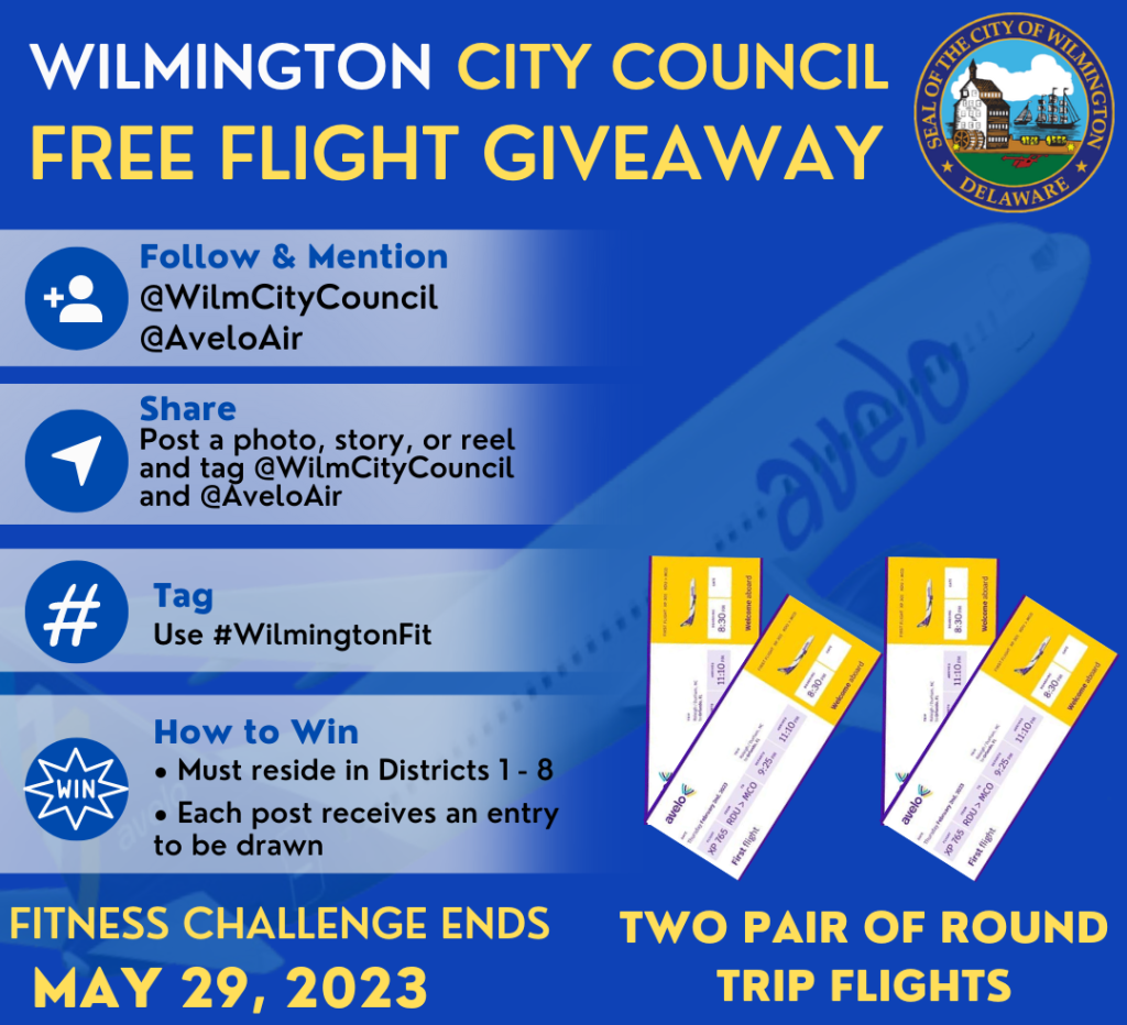 Wilmington City Council is giving away two pair of round-trip flights ✈️ thanks to Avelo Airlines The giveaway is part of President Trippi Congo‘s 2023 Fitness Challenge, which started on January 15, 2023, with a goal to motivate everyone in Wilmington to lead healthier lives. The challenge will end on May 29, 2023.