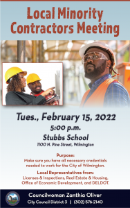 On Tuesday, February 15, 2022, Council Member Zanthia Oliver (3rd District), in partnership with the Delaware Department of Transportation (DelDOT) and City departments that include Licenses and Inspections, Real Estate and Housing, and the Office of Economic Development, will hold a “Local Minority Contractors Meeting” to provide minority contractors with access to information about doing business with the City, State and as a subcontractor. The meeting will also focus on the necessary paperwork contractors need to file to be up to date and licensed to work.