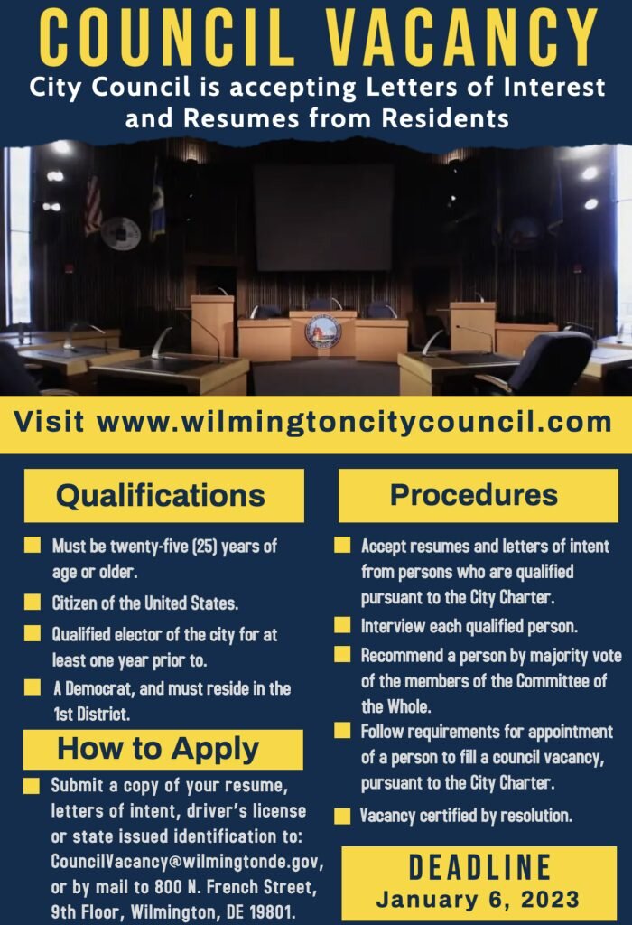 Those residents interested in filling the vacancy have until January 6, 2023, to submit resumes, letters of intent, and a copy of their driver’s license or state issued identification to the following email address: CouncilVacancy@wilmingtonde.gov