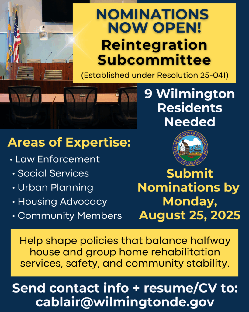 Wilmington, DE –  The Wilmington City Council is now accepting nominations for the Reintegration Subcommittee, established under Resolution 25-041 as a subcommittee of City Council’s Community Development & Urban Planning standing committee. ​ Members will take part in the formulation of legislative recommendations that balance public safety, halfway house and group home rehabilitation services, and community stability.