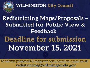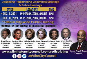 Members of the public can attend the redistricting meetings either online, or in-person in Council Chambers located at the Louis L. Redding City/County building at 800 N. French Street, Wilmington, DE 19801. The first City Council Redistricting Committee/Public Hearing took place on Wednesday, August 25, 2021 at 5pm and can be watched here. For all future meetings please visit our Wilmington City Council’s “Events Calendar” here for agenda and Zoom meeting details.