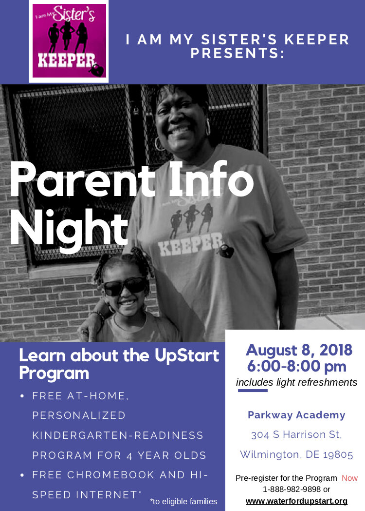 A parent information session on UPSTART, hosted by I am My Sister’s Keeper, Inc., is scheduled for August 8 from 6-8 pm at Parkway Academy.